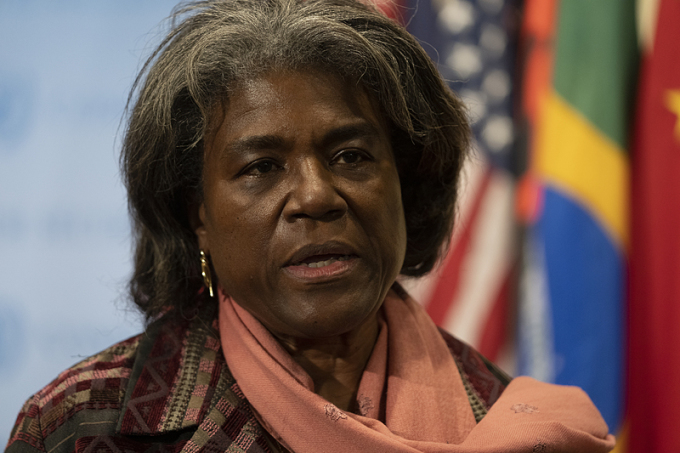 Đại sứ Mỹ tại Liên Hợp Quốc Linda Thomas-Greenfield phát biểu sau cuộc họp của Hội đồng Bảo an tháng trước. Ảnh: Reuters.