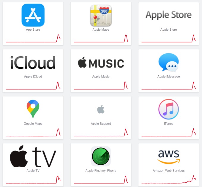Trên trang cập nhật trạng thái hoạt động của các dịch vụ từ Apple, hai màu xanh, đỏ liên tục đổi chỗ. Tuy nhiên, trong nhiều giờ, gần một nửa dịch vụ ở trạng thái màu đỏ - không hoạt động hoặc không hoạt động ổn định. Trên phiên bản dành riêng cho nhà phát triển, đa số ở trạng thái dừng hoạt động.