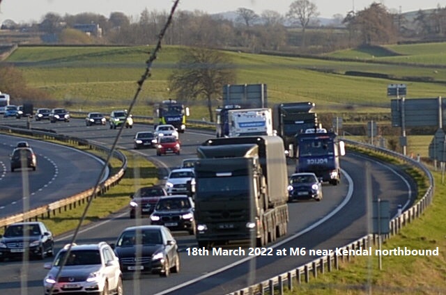 Nhiều hình chụp từ xa cho thấy, đoàn xe đi trên đường cao tốc M6 gần Kendal, Cumbria và đến đường cao tốc M74 tại Lesmahagow, cách Glasgow khoảng 40km về phía nam.