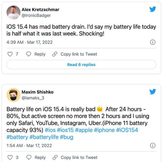 Người dùng lên Twitter phàn nàn iOS 15.4 gây hao pin.