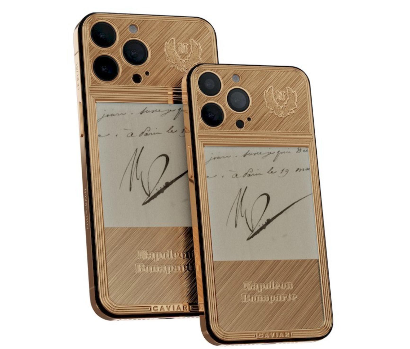 Caviar đã lấy chữ ký của hoàng đế Pháp Bonaparte từ một bức thư do đích thân ngài viết và tích hợp nó vào iPhone 13 Pro. Thân điện thoại được làm bằng vàng 24K và được định giá ở mức 75.090 USD (1,7 tỷ đồng). Ngoài ra, phiên bản iPhone 13 Pro có chữ ký của Elon Musk và Steve Jobs sẽ có giá khoảng 600 triệu đồng.
