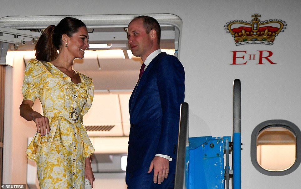 Hoàng tử William và vợ Kate Middleton cười rạng rỡ khi vẫy tay tạm biệt các quan chức người Bahamas khi lên máy bay hôm thứ Bảy tại Sân bay Quốc tế Lynden Pindling ở Nassau.
