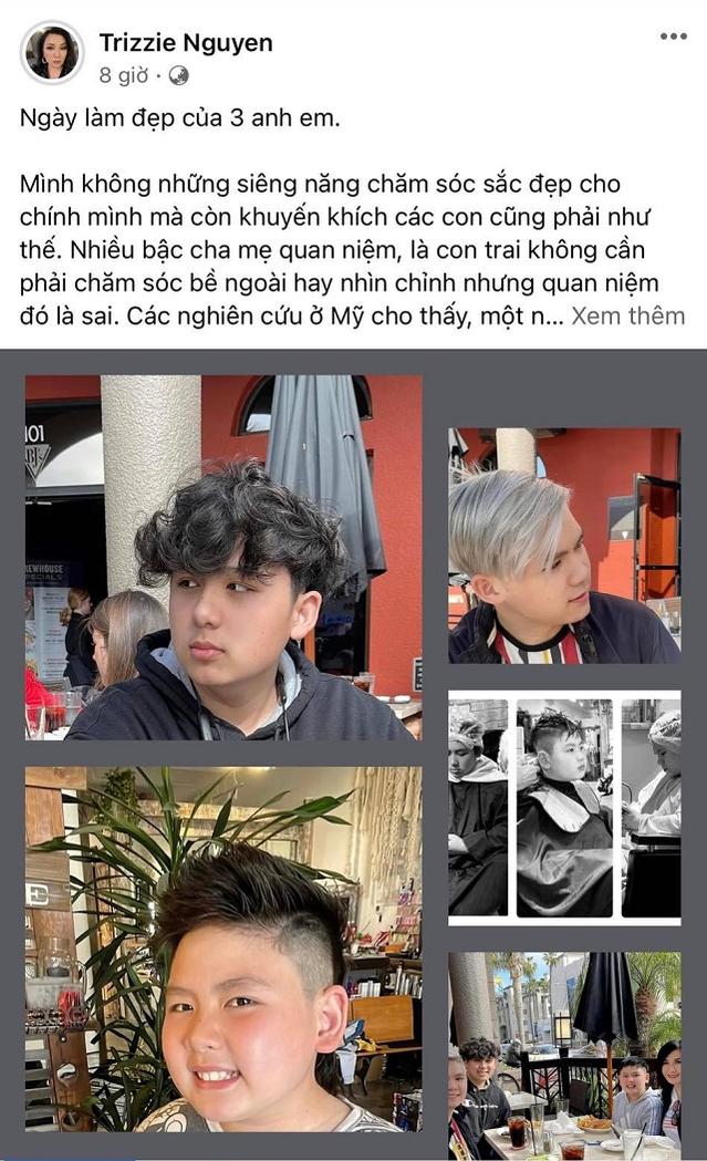 Trên trang cá nhân của mình. Trizzie Phương Trinh - vợ cũ Bằng Kiều đã chia sẻ khoảnh khắc đưa 3 cậu con trai đi ‘“làm đẹp”. Đồng thời bày tỏ quan niệm về chuyện phái nam phái nữ đều cần phải chú trọng “chăm sóc ngoại hình” của mình: