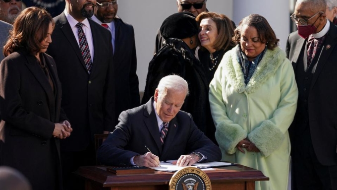 Tổng thống Joe Biden ký dự luật tại Vườn Hồng Nhà Trắng ngày 29/3. Ảnh: Reuters.
