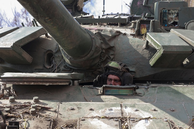 Quân nhân Ukraine lái xe tăng T-72 của Nga tại ngôi làng Lukianivka thuộc vùng Kyiv hôm 27/3. Ảnh: Reuters.