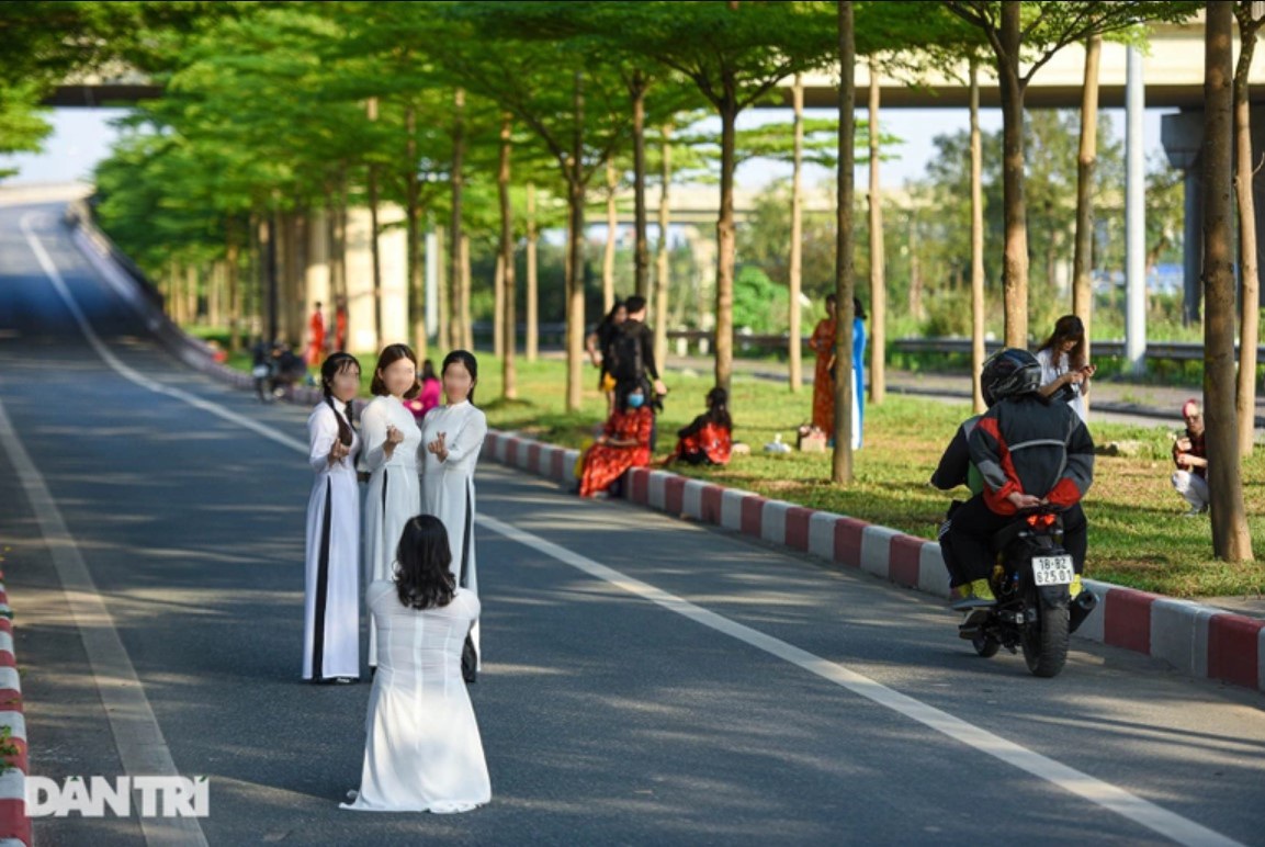 Con đường phục vụ xe cộ lưu thông bỗng biến thành địa điểm chụp ảnh của nhiều người, trong đó chị em phụ nữ chiếm đa số. Xe cứ chạy, người cứ chụp, bất chấp nguy cơ xảy ra tai nạn trong phút chốc.