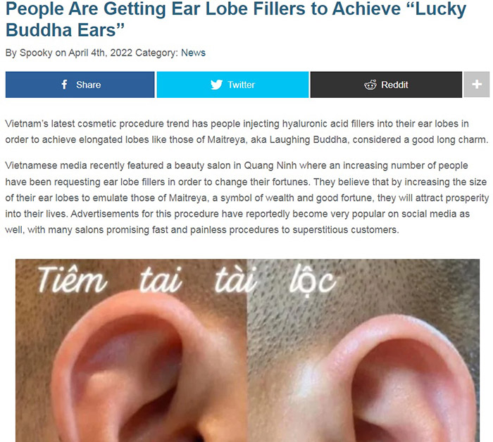 Trang OD đưa tin, có một thẩm mỹ viện ở Quảng Ninh, Việt Nam được nhiều người tìm đến yêu cầu độn dái tai để thay đổi vận mệnh. Họ tin rằng, bằng cách tăng kích thước tai của mình giống như Phật Di Lặc - một biểu tượng của sự may mắn, họ sẽ thu hút tài lộc, cuộc sống sẽ trở nên giàu có.