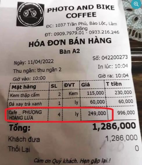 Hóa đơn tính tiền này có giá trị tổng cộng là 1.286.000 đồng. Trong đó, 4 ly cà phê Phượng Hoàng Lửa có giá đến 996.000 đồng.