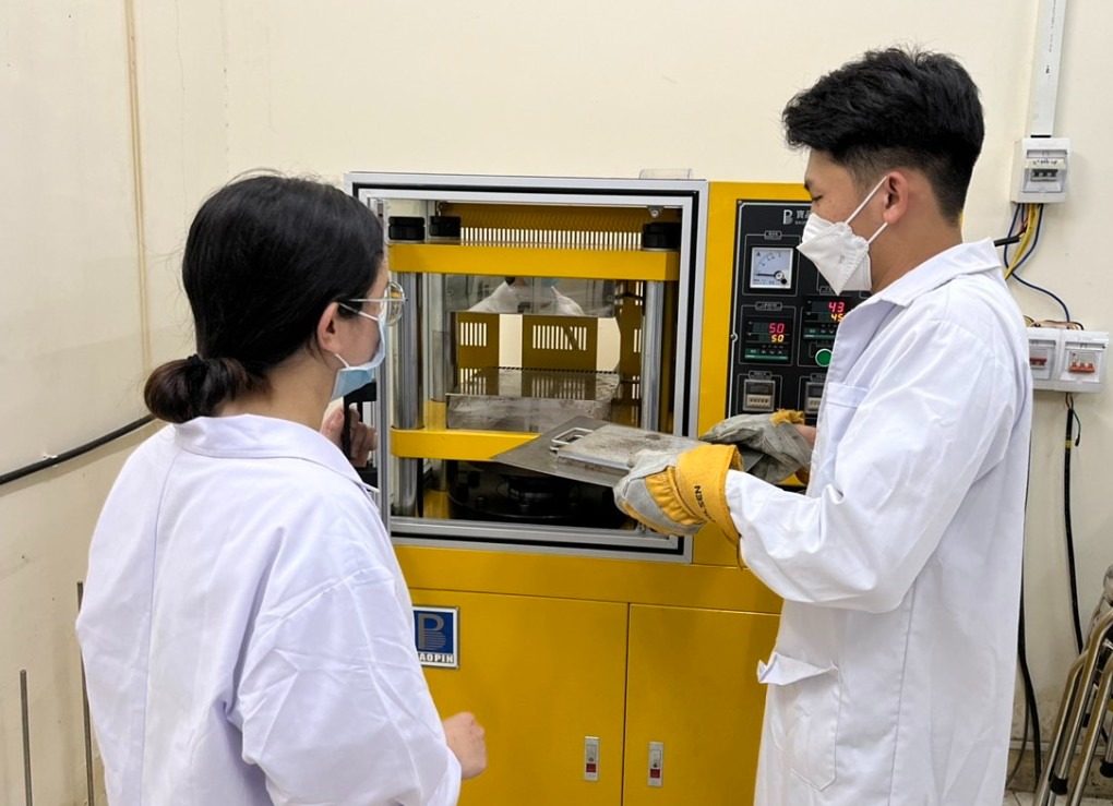 Nhóm thực hiện công đoạn ép nhiệt để tạo tấm nhựa PP trong phòng thí nghiệm. Ảnh: NVCC