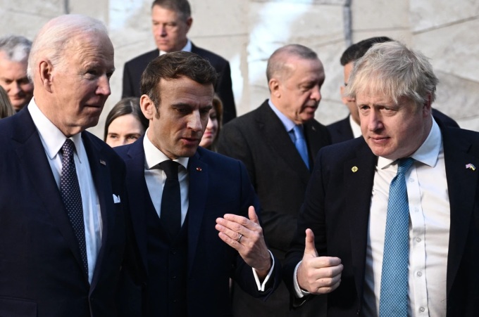 Hàng trên, từ trái qua: Tổng thống Mỹ Joe Biden, Tổng thống Pháp Emmanuel Macron và Thủ tướng Anh Boris Johnson tại trụ sở NATO ở Brussels, Bỉ hôm 24/3. Ảnh: AFP.