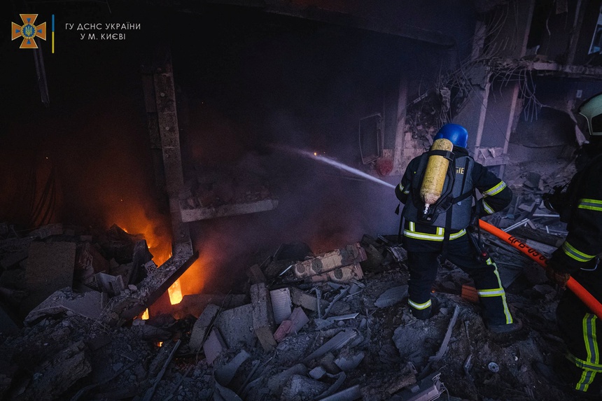 Lực lượng cứu hộ đang dập đám cháy tại ṭa chung cư tại Kyiv bị trúng tên lửa. Ảnh: Cơ quan T́nh trạng Khẩn cấp Ukraine.