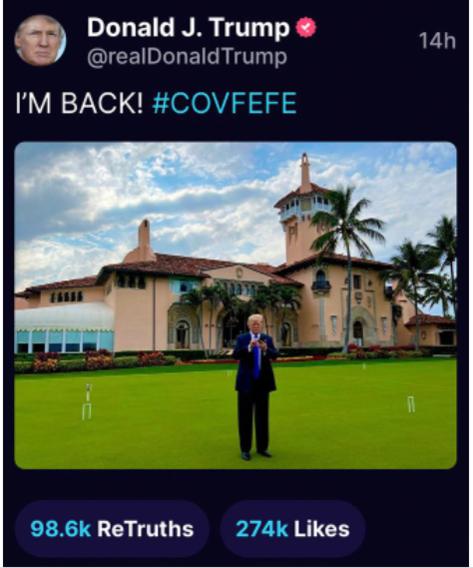 Bài đăng đi kèm với tấm ảnh vị cựu tổng thống đứng trên bãi cỏ xanh tại Mar-a-Lago, Florida.