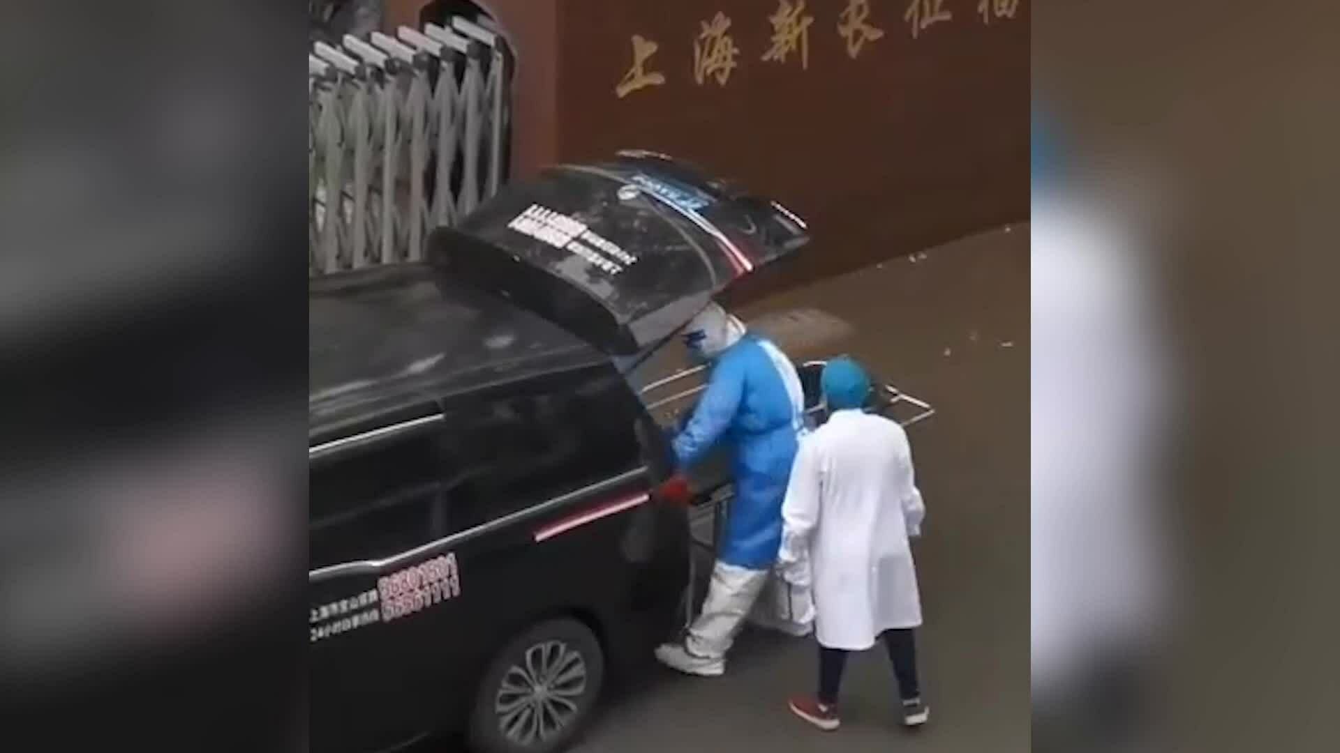 Mạng xã hội Trung Quốc lan truyền video cho thấy hai người đàn ông, dường như là nhân viên nhà xác, di chuyển chiếc túi đựng thi thể bên ngoài bệnh viện Tân Trường Chinh ở quận Phổ Đà, Thượng Hải, chiều 1/5.