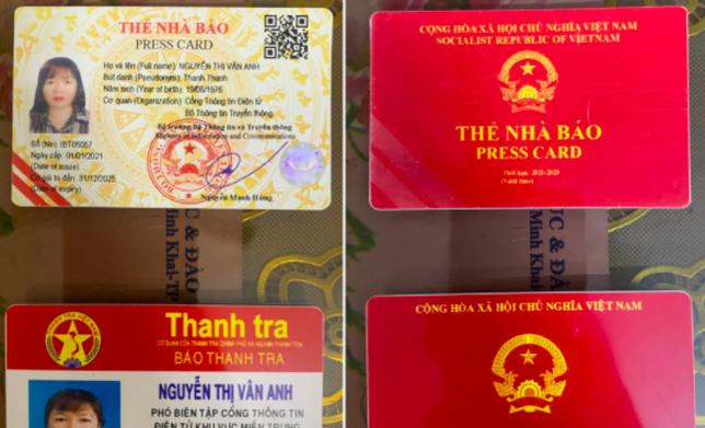 Không chỉ giới thiệu mình là nhà báo, bà Vân Anh còn đưa chiếc thẻ nhà báo mang tên Nguyễn Thị Vân Anh, bút danh là Thanh Thanh do Bộ Thông tin và Truyền thông cấp cùng chiếc thẻ công chức thanh tra chuyên ngành báo chí, mặt trước ghi là Nguyễn Thị Vân Anh, Báo Thanh tra với chức danh Phó biên tập Cổng thông tin điện tử khu vực Bắc Trung Bộ.