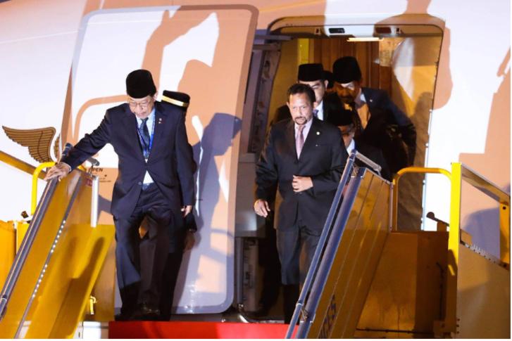 Quốc vương Brunei bước ra khỏi chuyên cơ riêng của mình. Nguồn: Twitter