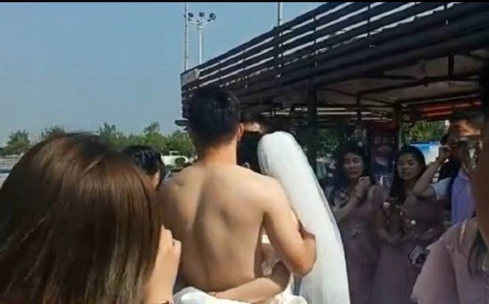 Sự việc diễn ra ngay giữa đường, trước thanh thiên bạch nhật nên cảnh tượng chú rể "không mảnh vải che thân" trông thực sự rất khó coi. May mắn thay, cô dâu đã nhanh chóng ứng biến bằng cách vội vàng che chắn vùng thân dưới của chồng bằng tà váy cưới to rộng của mình.