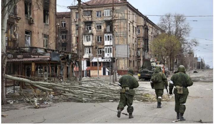 Các binh sĩ của lực lượng dân quân từ Cộng hòa Nhân dân Donetsk tự xưng đi ngang qua các tòa nhà chung cư bị hư hại gần Nhà máy luyện kim Illich Iron & Steel Works, doanh nghiệp luyện kim lớn thứ 2 ở Ukraine do lực lượng ly khai thân Nga hậu thuẫn kiểm soát ở Mariupol, Ukraine. Ảnh AP