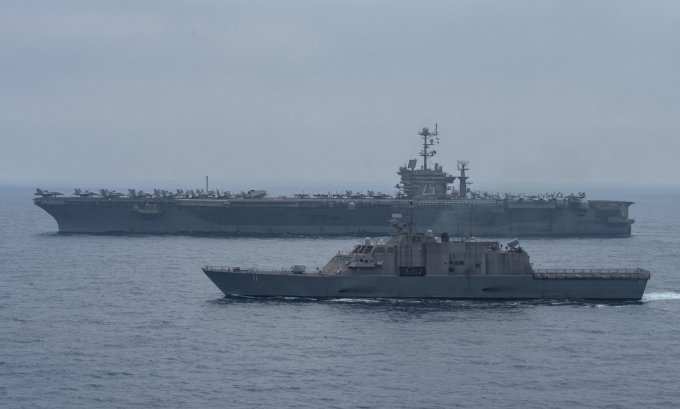 Tàu sân bay USS Harry S. Truman và tàu chiến đấu ven biển USS Siuox City trên Địa Trung Hải ngày 16/5. Ảnh: US Navy.