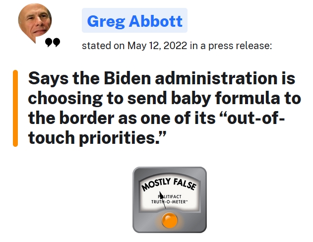 In a statement, Abbott said the Biden administration choosing to send baby formula to the border "is yet another one in a long line of reckless, out-of-touch priorities" on the border.