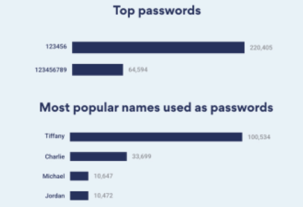 Tuy nhiên, những người đứng đầu doanh nghiệp có xu hướng đặt mật khẩu là tên gọi nhiều hơn chữ số, như "Tiffany" được phát hiện trong hơn 100.000 lần vi phạm, "Charlie" là 33.600 lần, còn "Michael" và "Jordan" là hơn 10.000 lần.