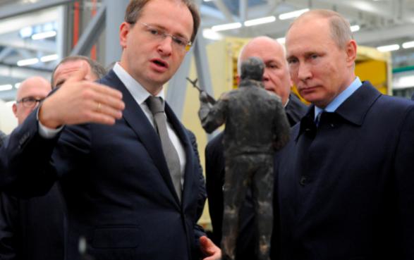 Ông Vladimir Medinsky (trái) - Nhà đàm phán hàng đầu của Nga trong các cuộc đàm phán hòa bình với Ukraine trò chuyện cùng Tổng thống Nga Putin. Ảnh Tass.