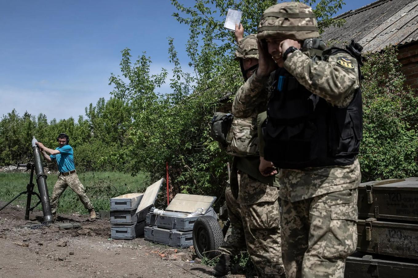 Các thành viên của một đội súng cối Ukraine ở làng Pytomnyk đang chuẩn bị khai hỏa về phía các vị trí của Nga cách đó 3,5km. Ảnh NY Times.