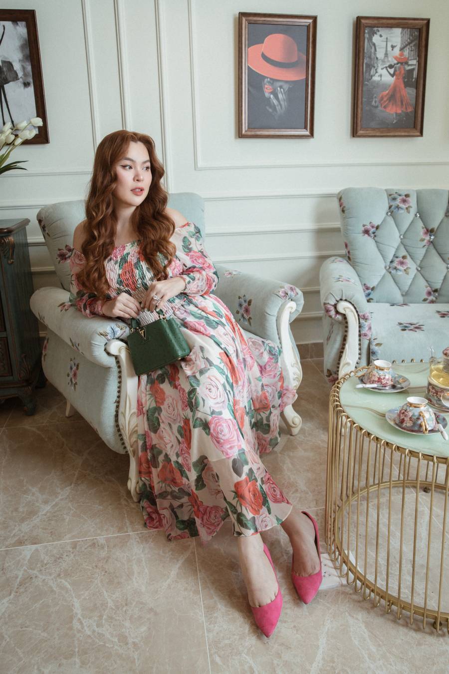 Xuất hiện trong bộ ảnh thời trang mới nhất, bà mẹ 3 con xinh tươi với loạt trang phục váy hoa nữ tính. Được biết, các thiết kế cô mặc do NTK Đỗ Mạnh Cường tặng riêng. Trang phục được sử dụng hoạ tiết hoa lá bắt mắt nhưng màu sắc nhã nhặn.