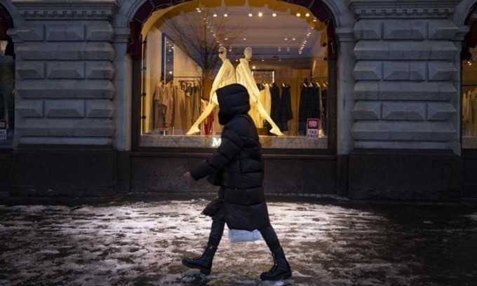 Người phụ nữ bước qua cửa sổ trưng bày tại một cửa hàng ở Quảng trường Đỏ, thủ đô Moskva, Nga, ngày 28/3. Ảnh: AP.