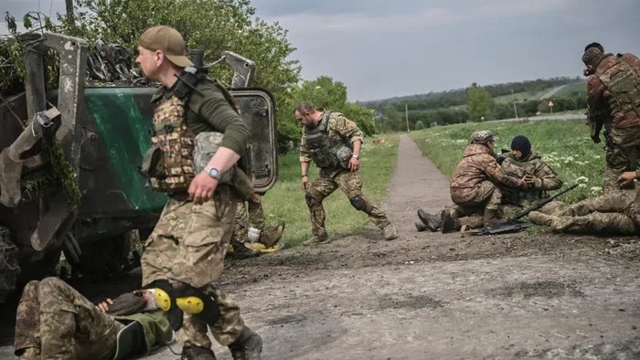 Binh sĩ Ukraine hỗ trợ đồng đội trên tiền tuyến tại Donbass ngày 21/5. Ảnh: AFP