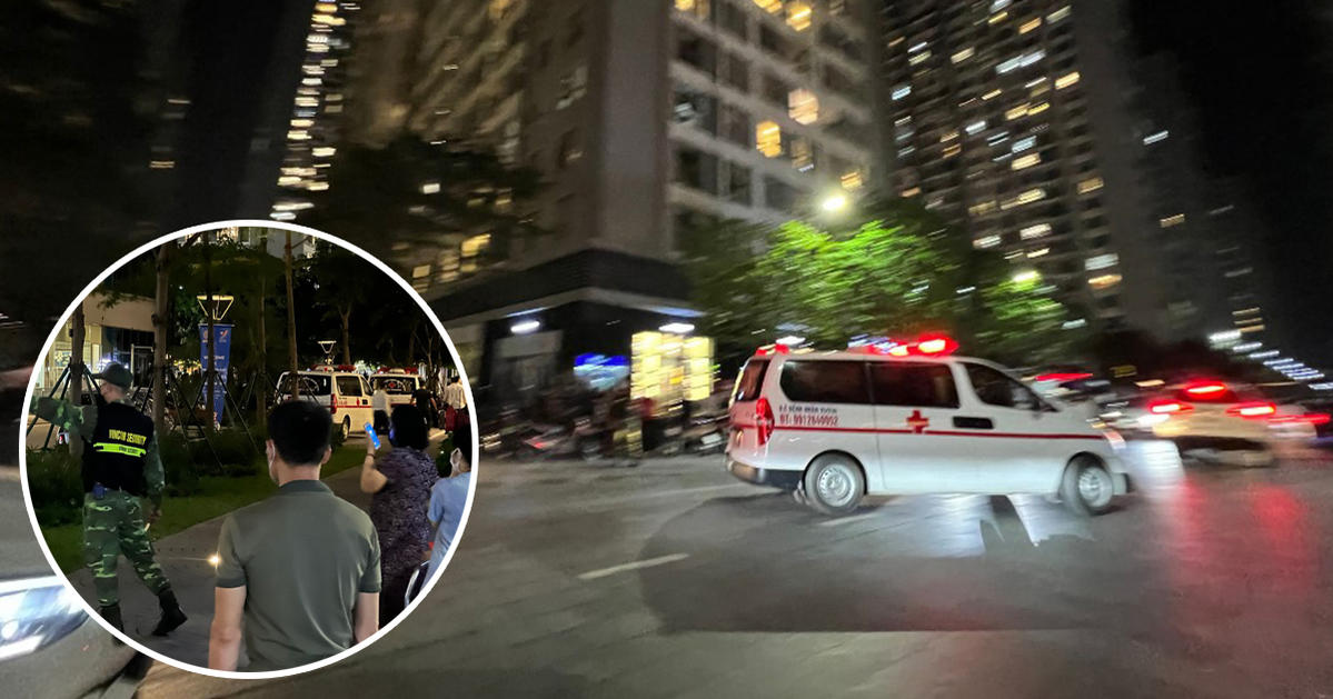 Từ 18h ngày 26/5, công an và pháp y có mặt khám nghiệm hiện trường, đồng thời lấy lời khai những người liên quan. Xe cứu thương cũng được điều đến sảnh Park 1. Phía bên ngoài, người dân tập trung bàn tán xôn xao.