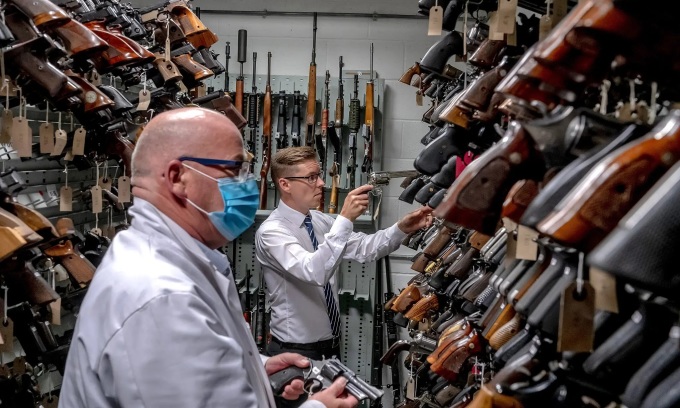 Nhân viên kiểm tra súng tại Cơ quan Tình báo Đạn đạo Quốc gia ở Birmingham, Anh. Ảnh: NY Times.