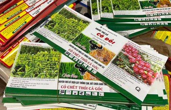 Nhãn hiệu thuốc trừ cỏ mang thương hiệu Việt được in sẵn để dán vào các chai nhựa mới chứa thuốc bảo vệ thực vật sang chiết từ can lớn.