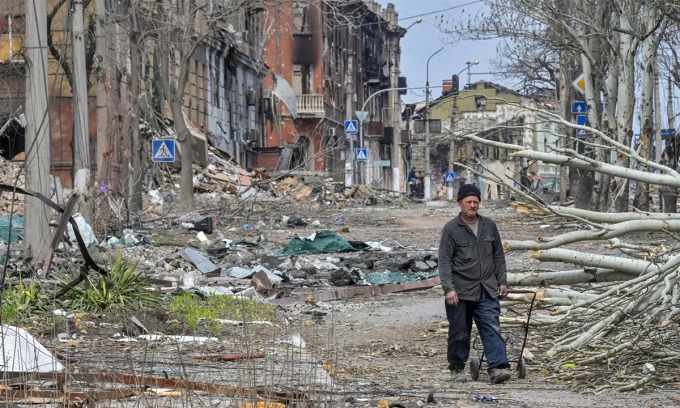 Người đàn ông đi qua con phố với những ngôi nhà bị hư hại trong giao tranh tại thành phố Mariupol, miền nam Ukraine ngày 8/4. Ảnh: RIA Novosti.