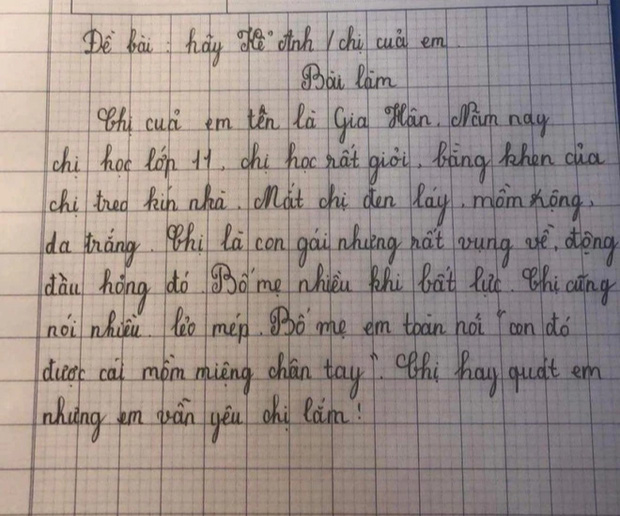 “Chị của em tên là Gia Hân. Năm nay chị học lớp 11, chị học rất giỏi, bằng khen của chị treo kín nhà. Mắt chị đen láy, mồm rộng, da trắng. Chị là con gái nhưng rất vụng về, động đâu hỏng đó. Bố mẹ nhiều khi bất lực. Chị cũng nói nhiều, lẻo mép. Bố mẹ em toàn nói “con đó được cái mồm miệng chân tay”. Chị hay quát em nhưng em vẫn yêu chị lắm".