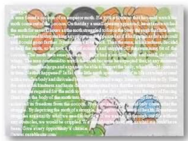 Một người tìm thấy một cái kén bướm chúa. Anh mang nó về nhà để có thể quan sát được quá trình ngài hóa bướm. Một hôm, trên thân kén xuất hiện 1 lỗ nhỏ; anh ta ngồi theo dõi nó có đến vài tiếng đồng hồ xem con bướm đang ráng sức chui mình qua cái lỗ nhỏ đó. Có vẻ như những cố gắng của nó không ăn thua gì cả. Nó đã dùng hết sức mình để thoát nhưng vẫn chưa đi đến đâu, vì vẫn còn bị dính chặt vào cái kén. Bấy giờ, anh bạn của chúng ta, với lòng từ tâm của mình, quyết định trợ giúp con bướm thoát ra. Anh đi kiếm cái cặp díp và dùng nó gỡ những mẩu vỏ kén còn bám lấy nó và khi đó bướm dễ dàng chui lọt ra ngoài. Thế nhưng con bướm lúc đó có thân hình phồng sưng với đôi cánh nhỏ xíu, nhăn nheo. Anh tiếp tục theo dõi con bướm vì hy vọng đến lúc nào đó, đôi cánh sẽ xòe ra, giang rộng và thân bướm sẽ thon nhỏ trở lại và có thế cất cánh bay lên. Nhưng chẳng có gì xảy ra giống như thế cả! Chút thời gian còn lại của sự sống, con bướm chỉ biết bò trườn với tấm thân sưng phồng và đôi cánh nhăn nheo. Nó chẳng bao giờ có thể bay lên được. Một điều mà con người từ tâm của chúng ta không thể hiểu nổi là: cái kén giam hãm, tù túng và sự nỗ lực của con bướm hòng chui qua cái lỗ nhỏ trên vỏ kén chính là cái cách mà nó ép chất lỏng trong thân thể nó thoát ra, chảy vào đôi cánh của nó để nó có thể bay lên được một khi nó chui thoát ra khỏi vỏ kén. Tước đoạt cơ hội đấu tranh của con bướm, anh ta đã làm cho nó ốm yếu đi.