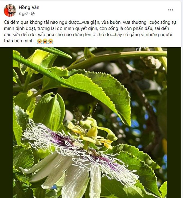Mới đây, trên trang cá nhân, NSND Hồng Vân đã có dòng chia sẻ đáng chú ý, cụ thể như sau: 'Cả đêm qua không tài nào ngủ được, vừa giận, vừa buồn, vừa thương cuộc sống tự mình định đoạt, tương lai do mình quyết định, còn sống là còn phấn đấu, sai đến đâu sửa đến đó, vấp ngã chỗ nào đứng lên ở chỗ đó. Hãy cố gắng vì những người thân bên mình'.