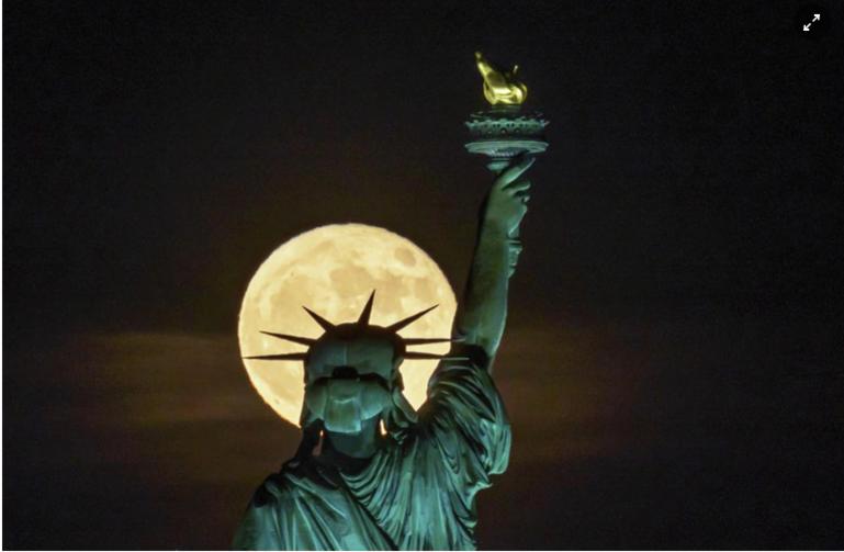 Khi xảy ra hiện tượng siêu trăng, trăng tròn dường như lớn hơn bình thường và đôi khi có màu hơi cam. Theo Cơ quan Hàng không Vũ trụ Mỹ (NASA), hiện tượng siêu trăng xảy ra khi Mặt Trăng ở gần Trái Đất nhất. Trong ảnh, siêu trăng rọi sáng tượng Nữ thần Tự do ở New York (Mỹ).