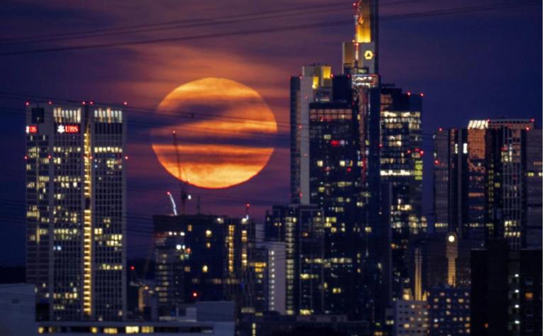 Ở Frankfurt (Đức), trăng nhô lên phía sau các tòa nhà tại khu vực gồm nhiều ngân hàng trong thành phố.