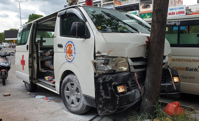 Xe cấp cứu hư hỏng nặng khi đâm vào gốc cây. Ảnh: Nguyên Anh