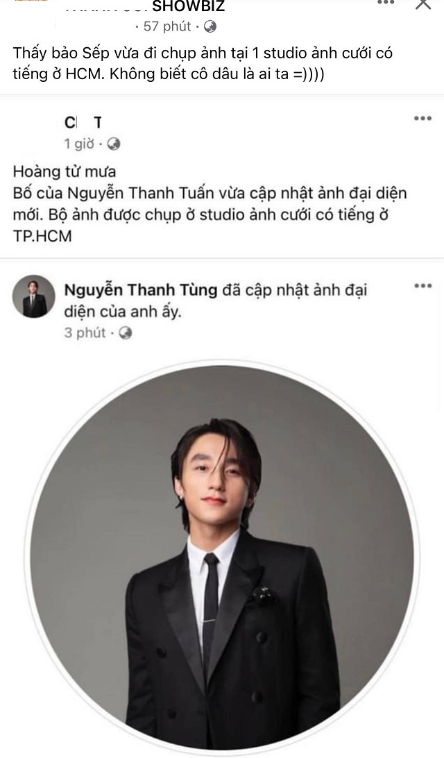 Chỉ vài giờ sau khi cập nhật avatar mới, cư dân mạng xôn xao trước một bài đăng chia sẻ lại hình ảnh mới nhất của giọng ca Cơn Mưa Ngang qua kèm caption: “Thấy bảo sếp vừa đi chụp ảnh tại một studio ảnh cưới có tiếng ở thành phố Hồ Chí Minh. Không biết cô dâu là ai ta”.