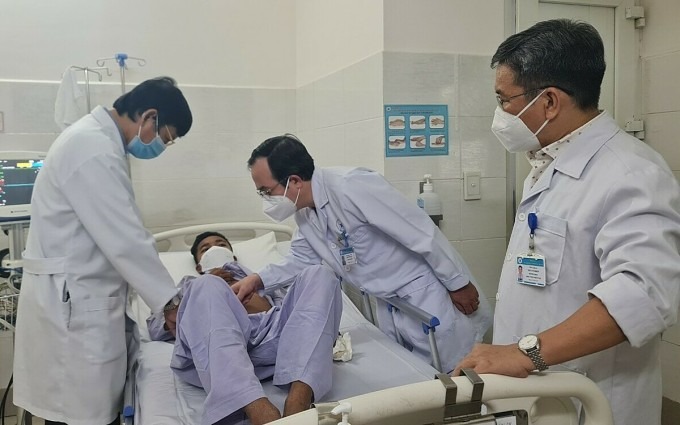 Các bác sĩ kiểm tra vết mổ cho Khoa, sáng 23/6. Ảnh: Lê Phương