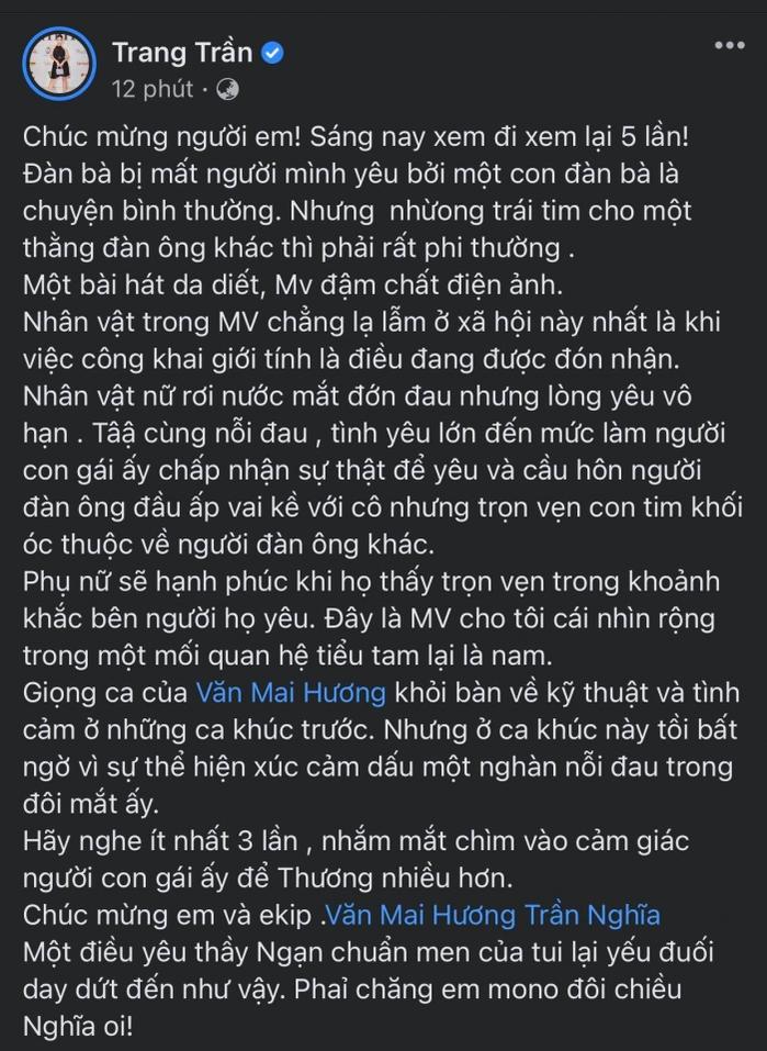 Mới đây Trang Trần đăng đàn chia sẻ cảm nhận sau khi xem MV “Một ngàn nỗi đau” của Văn Mai Hương: