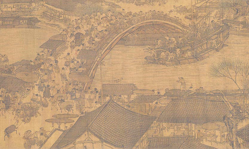 Nửa trái vẽ khung cảnh đối lập, tái hiện thường nhật nhộn nhịp ở phố thị. Sự phồn hoa ở thời Bắc Tống được khắc họa qua chi tiết như bến cảng, cửa hàng, chợ phiên... Trương Trạch Đoan vẽ khoảng 814 người, hơn 60 con vật, 28 chiếc thuyền, hơn 30 căn nhà, 20 chiếc xe, tám chiếc kiệu, hơn 170 cây. Con người hiện lên đa dạng với đủ ngành nghề, từ người làm ăn buôn bán, người biểu diễn tạp kỹ, gánh hát đến ăn mày, tăng nhân, thầy bói, lang y, thợ cắt tóc, người kinh doanh khách sạn, thợ mộc, thợ rèn, thư sinh...