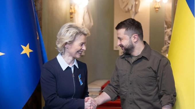 Tổng thống Volodymyr Zelenskyy (trái) trong một cuộc gặp với Chủ tịch Ủy ban châu Âu Ursula von der Leyen (Ảnh: UPPS).