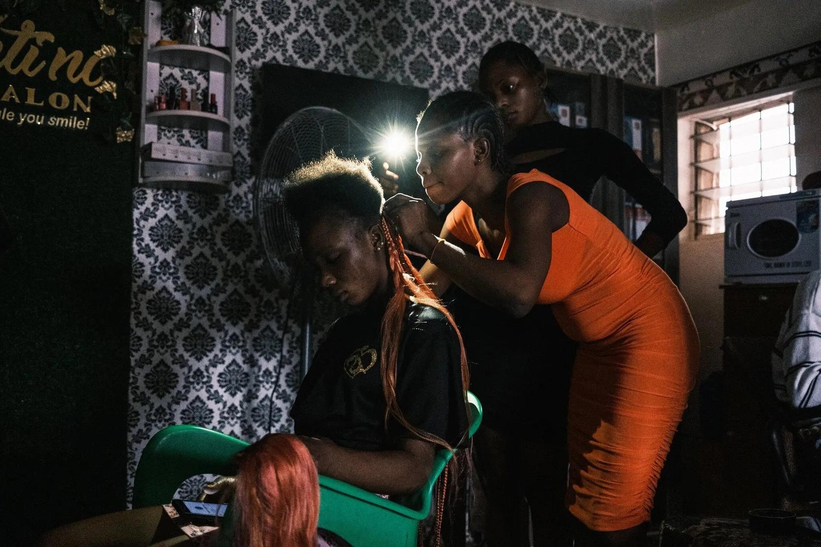Ở Nigeria, các nhà tạo mẫu sử dụng ánh sáng của điện thoại di động để cắt tóc vì họ không có đủ nhiên liệu cho máy phát điện chạy bằng xăng.