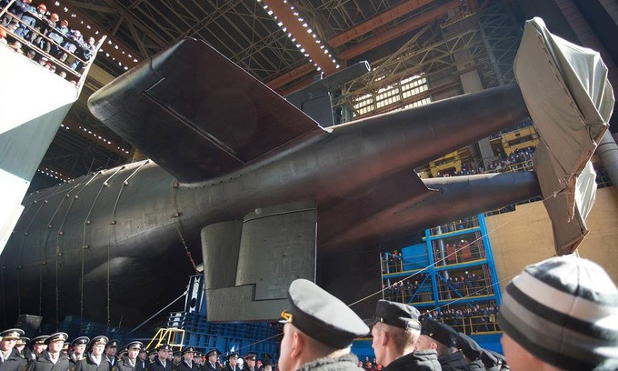 Lễ hạ thủy tàu ngầm Belgorod tại nhà máy Sevmash hồi tháng 4/2019. Ảnh: TASS.