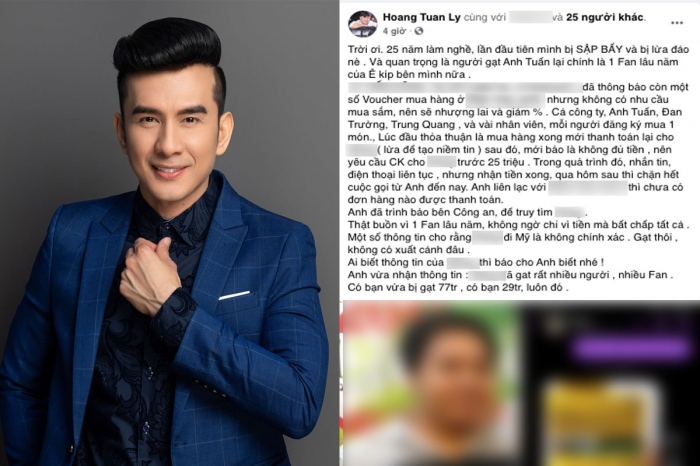 ''Trời ơi, 25 năm làm nghề, lần đầu tiên mình bị sập bẫy và bị lừa đảo nè. Và quan trọng là người gạt anh Tuấn lại chính là 1 fan lâu năm của ê-kíp bên mình nữa. Vy Tiến Dũng, đã thông báo còn một số Voucher mua hàng, nhưng không có nhu cầu mua sắm, nên sẽ nhượng lại và giảm %.