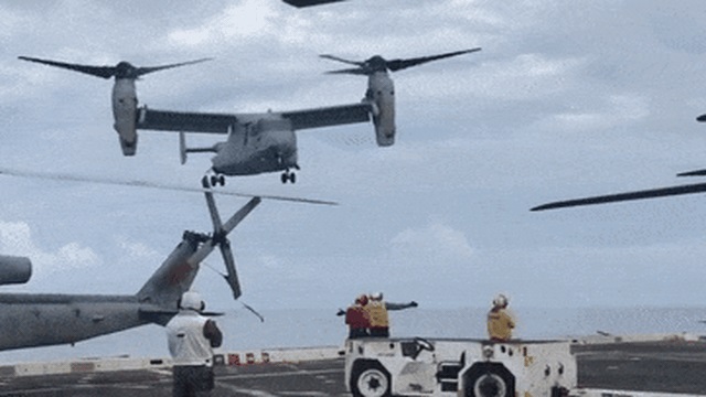 Máy bay đa nhiệm có khả năng cất hạ cánh thẳng đứng MV-22B Osprey vẫn mang theo nhiên liệu và nếu cánh quạt của nó va vào sàn đáp hoặc bất kỳ vật thể nào khác, chúng sẽ vỡ thành những mảnh lớn tốc độ cao có thể cắt đôi người - hoặc máy bay.