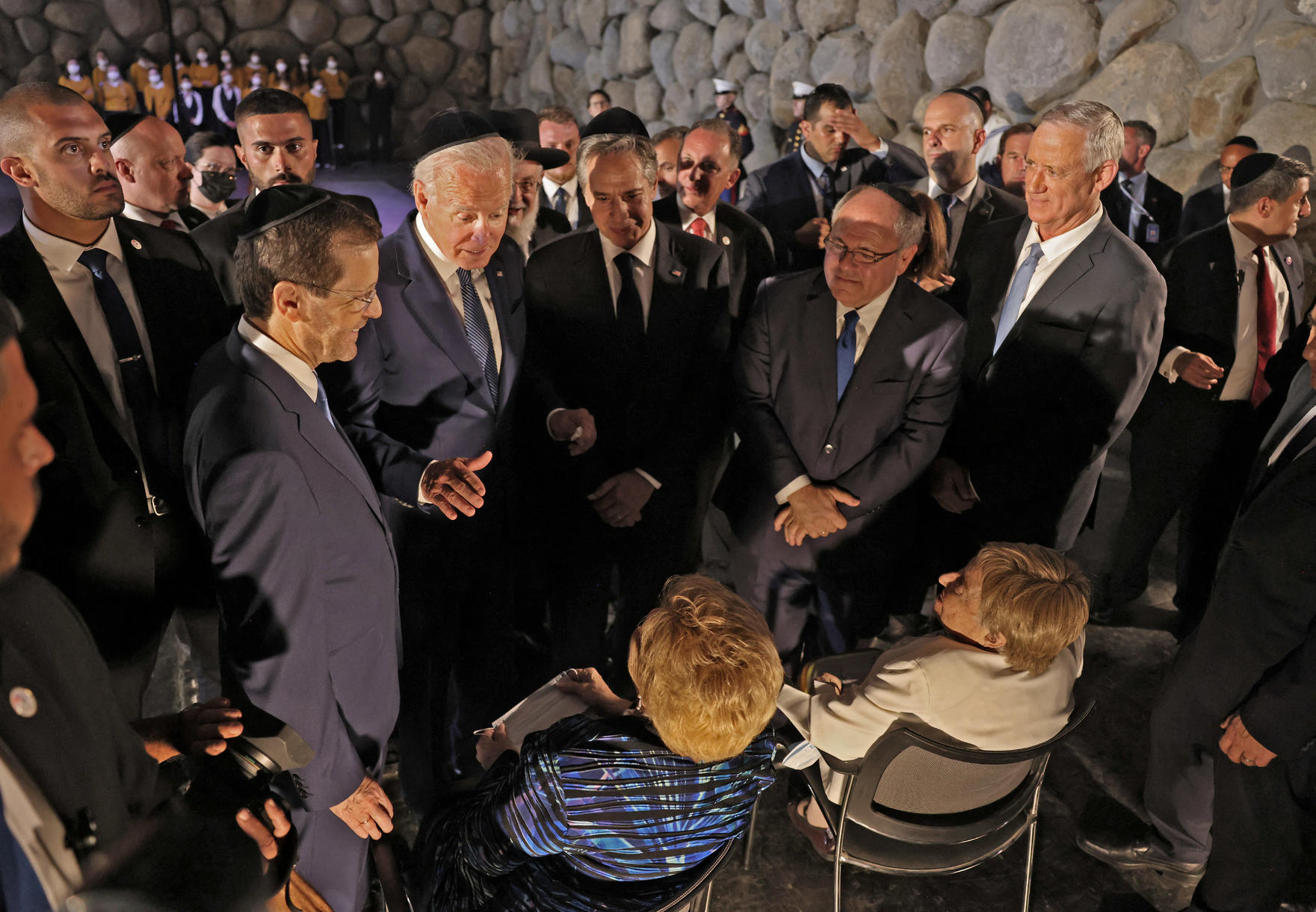 Tổng thống Mỹ Biden đội "mũ sợ Chúa" của người Do Thái và trò chuyện với những người sống sót sau cuộc diệt chủng của Đức quốc xã, trong chuyến thăm Israel ngày 13-7 - Ảnh: REUTERS