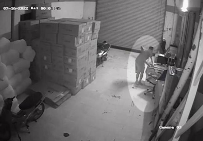 Hình ảnh từ camera an ninh cho thấy, rạng sáng ngày 16-7, một nam thanh niên chui qua khe cửa cuốn rồi vào trong xưởng dệt.